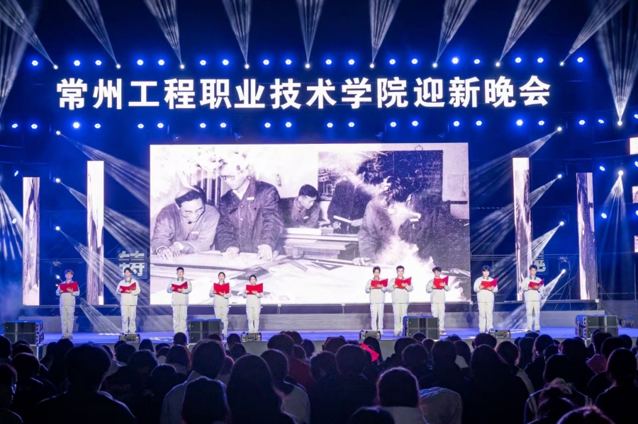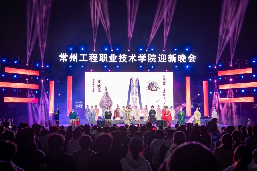 第二篇章“浸润·韶华诗篇”内容丰富,寓意深远。国交处、通识部、统战部朗诵节目《青春万岁》由中外新生代表共同演绎,彰显了青春的多元与包容;情景剧《向战而生》由联勤保障部队第九〇四医院与心理健康中心联合呈现,致敬英雄,升华了爱国情感;校企合作单位中车戚墅堰机车有限公司带来的朗诵《中车赋》,展现了产业报国的厚重传承;化工学院舞蹈《薪传》,以富有张力的肢体语言,演绎了红色血脉代代相传、生生不息的深刻主题。随后,由设计学院、校汉服社等单位联合表演的国风秀《又见红楼大明风华》,别出心裁地将明代服饰介绍与T台走秀相结合,为全场师生带来了一场生动的汉服美学巡礼。各二级学院党总支书记以视频形式向全体2025级新生送上寄语,表达对全体新生的殷切期望与暖心鼓励。