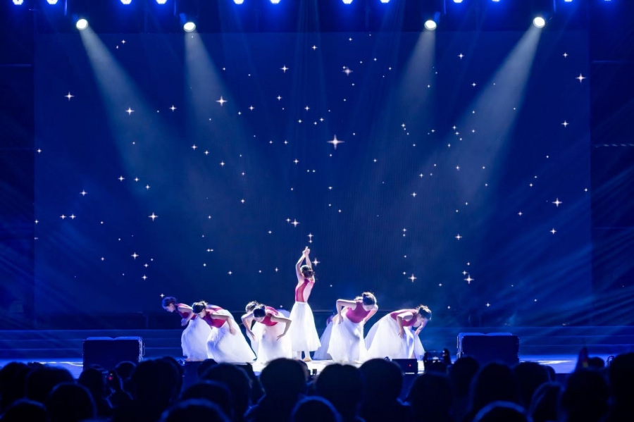 在倒计时的期盼声中,一场动感梦幻的灯光秀拉开了晚会的帷幕。体育学院带来的舞龙舞狮表演震撼开场,翻腾跳跃之间尽显中华优秀传统文化的磅礴气韵。龙影未消,校合唱团带来的歌舞《我们都是追梦人》以昂扬歌声与跃动舞步奏响青春序曲,随着8名旗手携校旗、院旗热血入场,全场热情瞬间点燃。