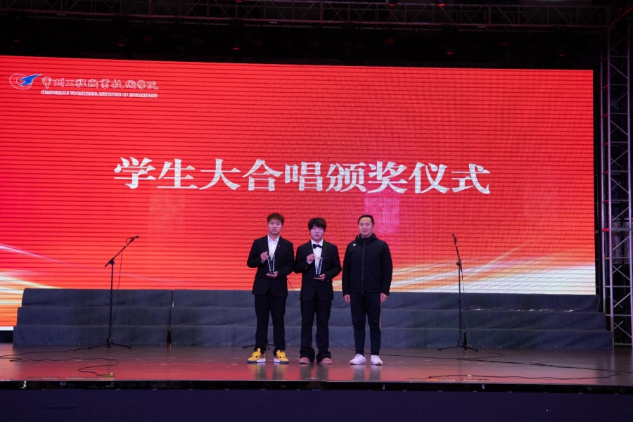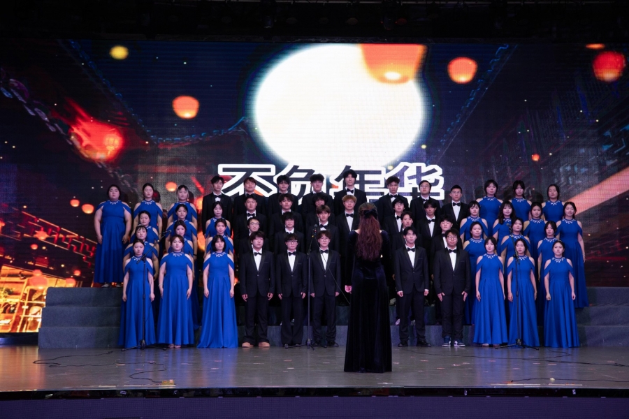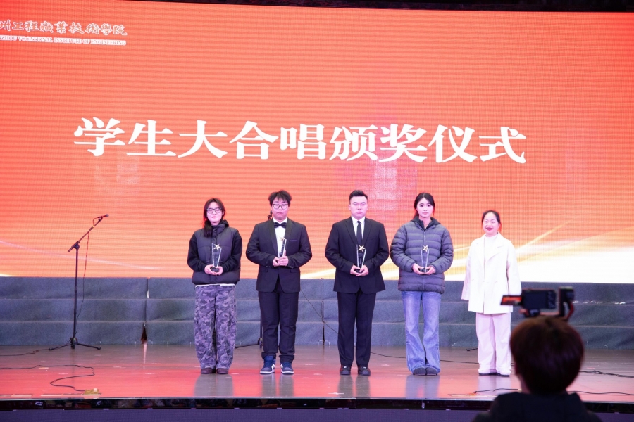 在学生大合唱比赛环节。智造、检测、体育、建工、经管、设计、化工七个学院代表队依抽签顺序先后登场,深情演绎了《我的自白书》《灯火里的中国》《保卫黄河》《在太行山上》《不忘初心》等十余首经典曲目;校合唱团亦献上《不负年华》《飞云之下》两首作品,以专业的和声与真挚的情感将现场气氛推向高潮。本次比赛在演绎形式上积极创新,各学院在演唱前增设1分钟“艺术微宣讲”,深入阐释所选曲目的历史背景与精神内涵,将红色故事讲述融入歌声之中,把家国情怀与青春理想汇入激昂旋律,使舞台不仅成为艺术的展示窗口,更化为一堂生动的思想政治教育课。
