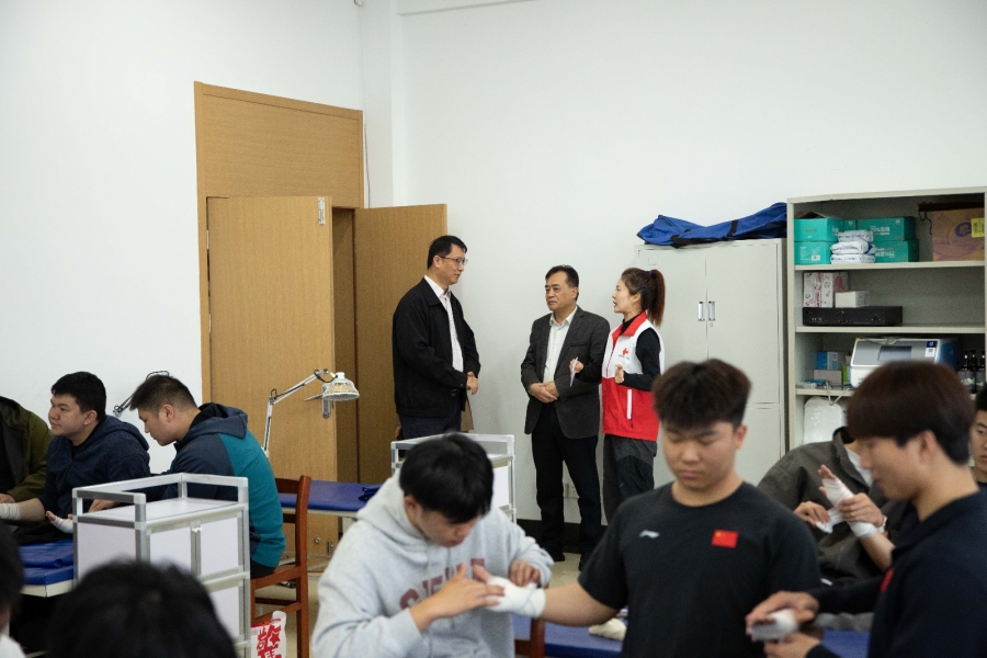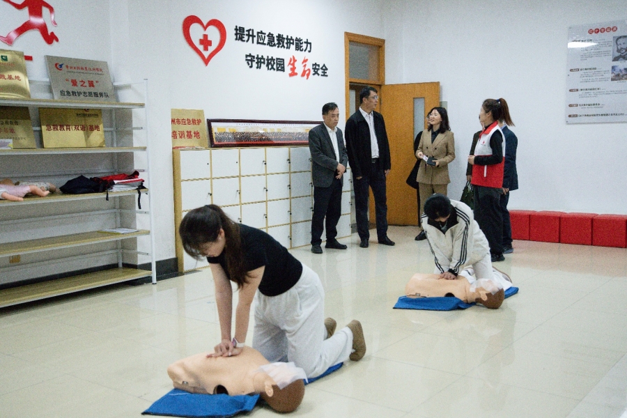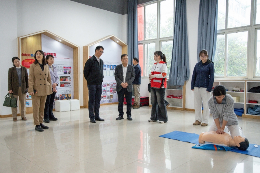 林凤勇一行首先实地考察了我校红十字工作阵地建设与运行情况。在学校红十字应急救护培训基地,调研组现场观摩师生应急救护实操演练,察看红十字急救教育双语教学基地、生命教育体验馆等特色场所,深入了解学校依托专业群优势,在创新开展救护培训、拓展社会服务等方面的特色举措与显著成效。在 “一站式” 学生社区红十字服务站,林凤勇认真听取红十字组织全面融入学生教育管理与成长服务的工作汇报,并勉励在场学生骨干在志愿服务与奉献实践中锤炼本领、增长才干。调研组还参观了设计学院师生创作的红十字文创产品与空间展陈作品,师生代表的精彩讲解获得调研组一致好评。